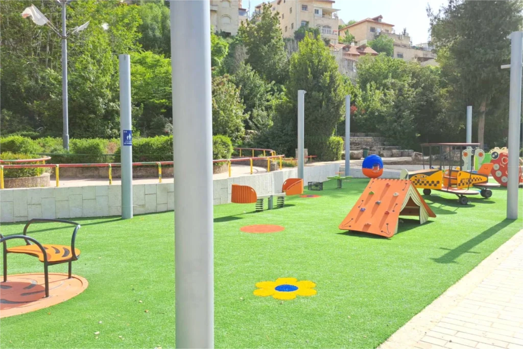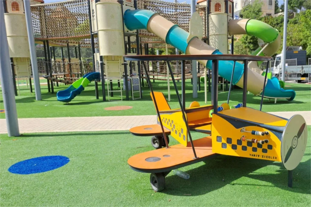 This impressive playground was designed to create a world of adventure where children of all ages can explore, challenge themselves, and let their imaginations run free. At the heart of the project stands the magnificent “Metzada” castle—a large, multi-level play structure featuring seven interconnected towers. Each tower is linked by bridges, climbing routes, and slides, forming a continuous journey of movement, excitement, and discovery. The design thoughtfully incorporates a wheelchair-accessible ramp, ensuring that children of all abilities can enjoy the full experience and feel part of the fun.