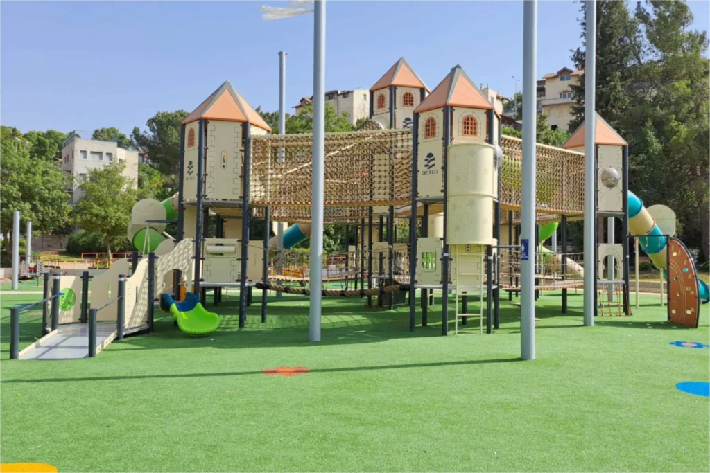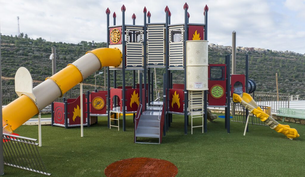 At the heart of the playground stands a castle-inspired play structure filled with towers, bridges, climbing routes, and slides. Each element is designed to feel like part of a larger story, encouraging role-play, cooperation, and movement. Children can climb to new heights, cross bridges like brave explorers, and race down slides as if escaping a legendary quest. The layered design offers varying levels of challenge, making the castle engaging for different ages and abilities.