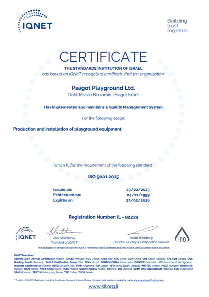 Our products comply with leading global playground and consumer safety standards, including ISO 9001 for quality management, CPSC requirements for children’s product safety in the United States, and TÜV SÜD testing and approval. We are also certified by IPEMA, confirming compliance with ASTM F1487 — the American standard for public playground equipment — ensuring durability, age-appropriate design, and safe use in public spaces.
