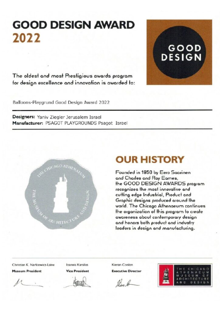 Balloons” is a GOOD DESIGN® Award–winning playground inspired by hot air balloons, featuring a colorful and imaginative design. It offers inclusive play with wheelchair-accessible bridges and activities for children of all abilities. The award reflects Psagot Playgrounds’ commitment to innovative and safe playground design.