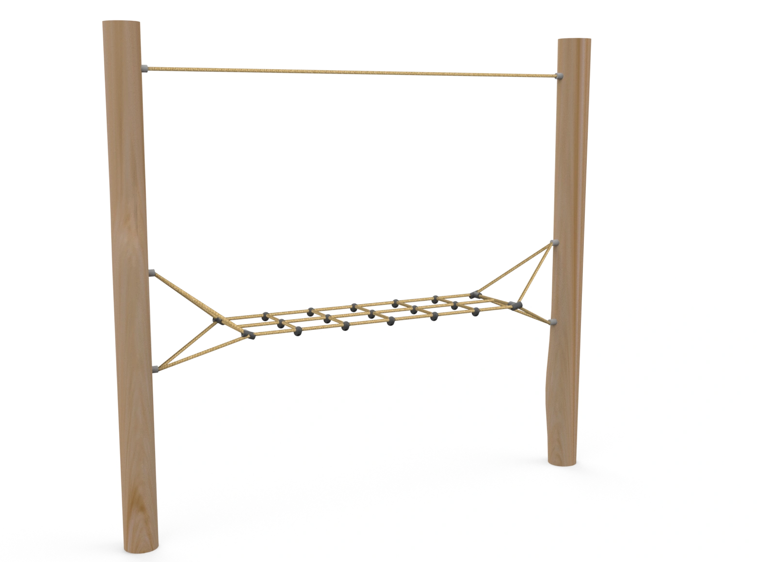 The Astoria-Megler Bridge A structure is made from European Robinia wood and is part of the Big Four Bridge challenging ropes course. It consists of two stable wooden posts with a rope net stretched between them. It is designed for balance challenges and stable movement using hands and feet, while improving coordination and strength. This structure can stand independently, providing a unique and challenging climbing experience for children and youth.