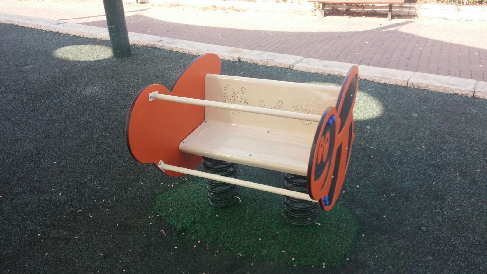 Bee-shaped bench for two. The bee figure is made of galvanized, rolled, and painted metal with HDPE siding. The rocking experience that the spring allows is beloved by young children due to the rhythmic and cyclical movement, and many children integrate role-play of galloping and dashing into the experience.