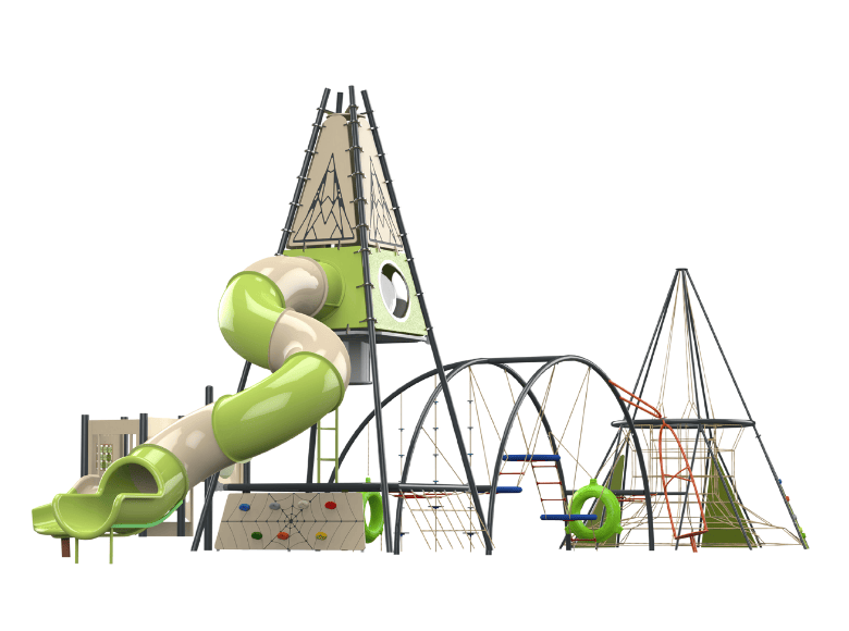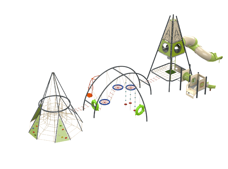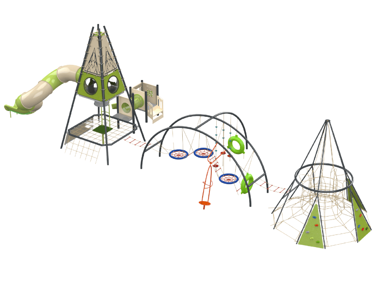 The Detroit B is an extreme play system that is comprised of three different challenging and climbing strucutres combined as one play system. A climbing pyramid with ropes and slides, followed by an arched structure with elements for climbing and spinning, and finally a climbing pyramid with climbing walls and a rope system. The different parts of the play system are interconnected, creating a diverse and challenging play experience that includes climbing, sliding, and maneuvering between obstacles. Each part of the play system is designed to develop physical abilities such as strength, balance, and coordination, and is suitable for various age groups.
