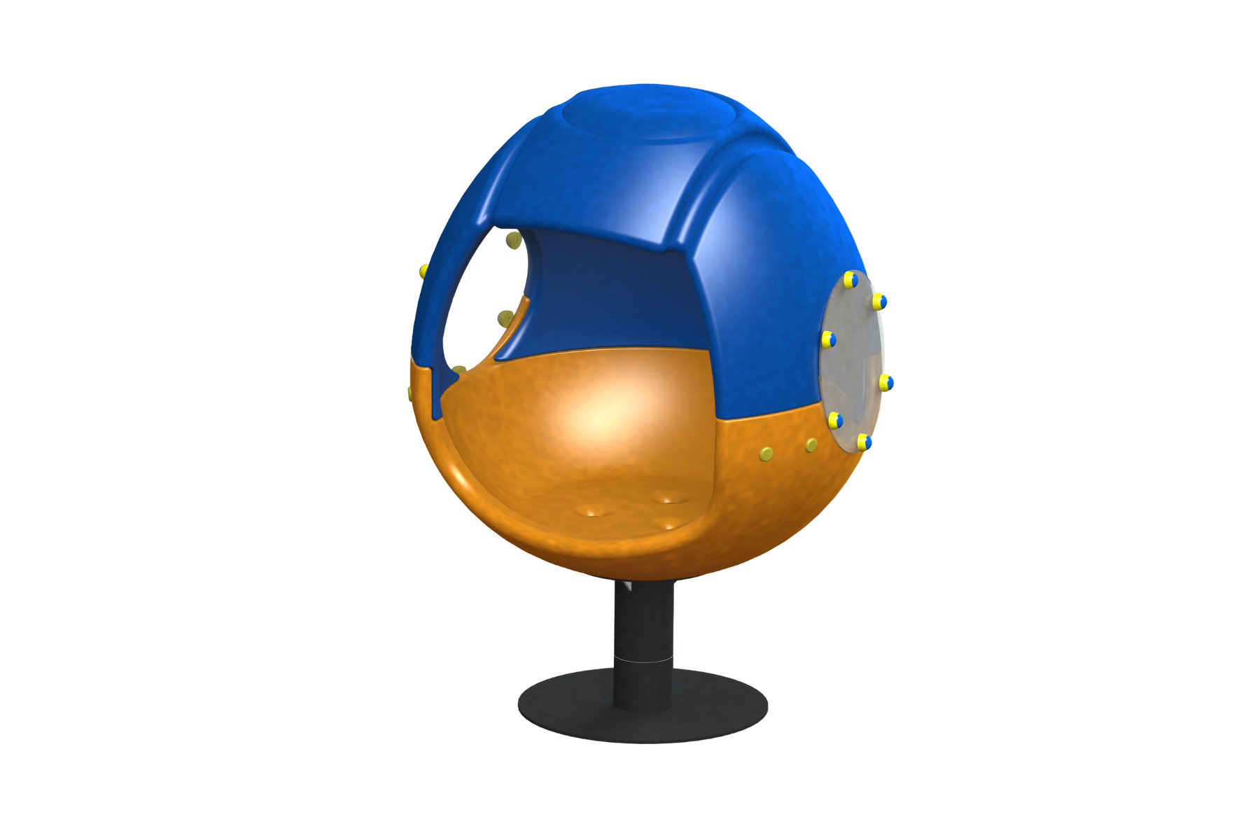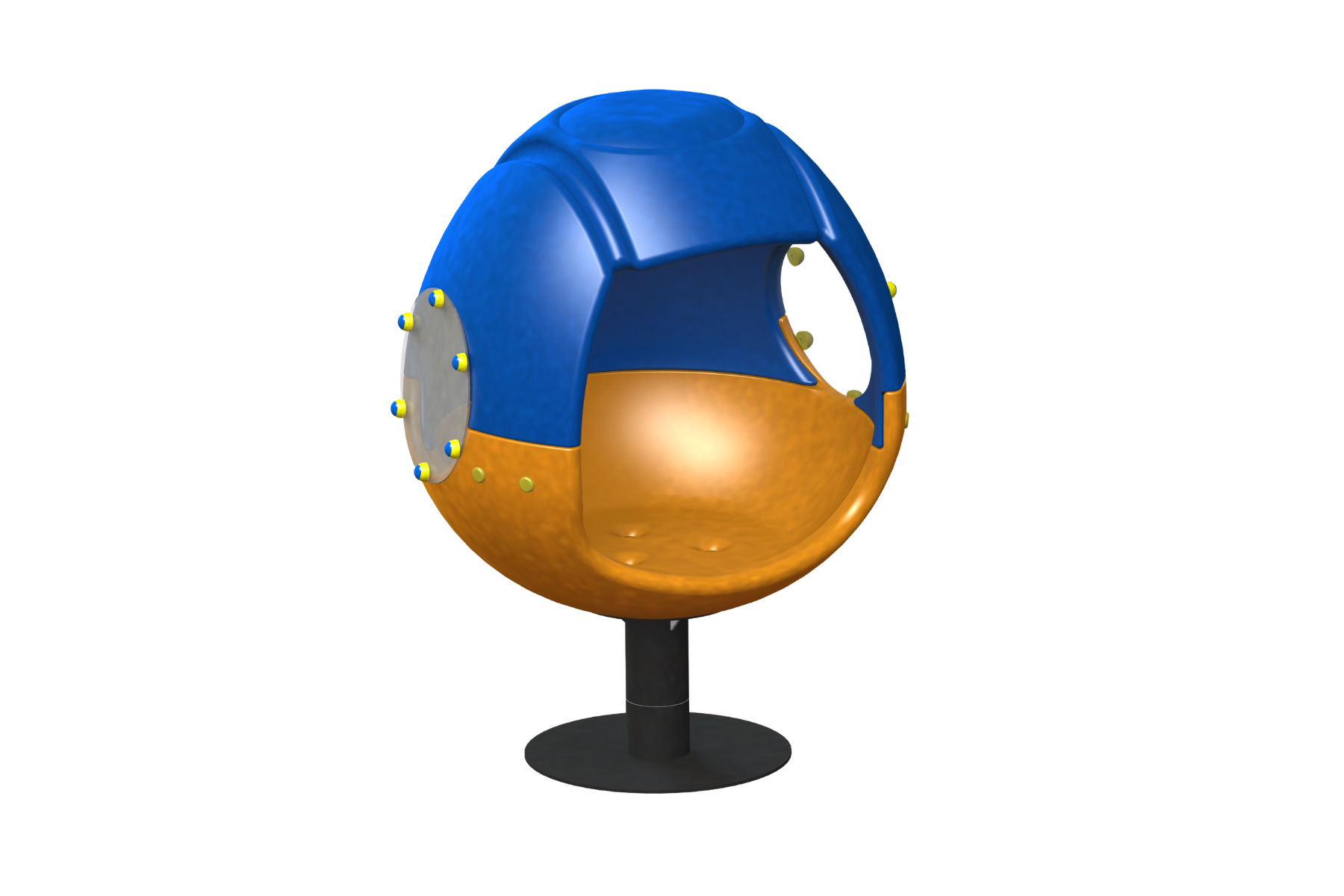A cozy, shell-shaped sitting carousel. Suitable for movement and spinning games. Peepholes allow communication between those sitting inside and those spinning them.