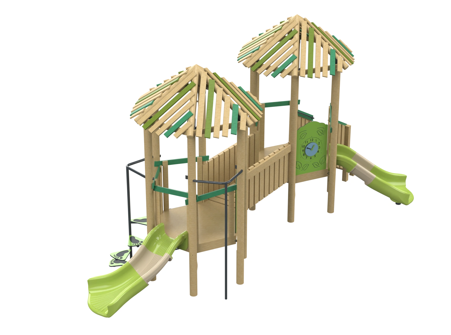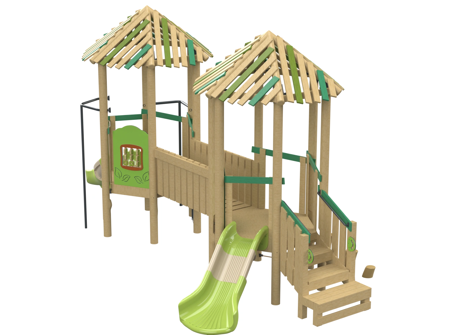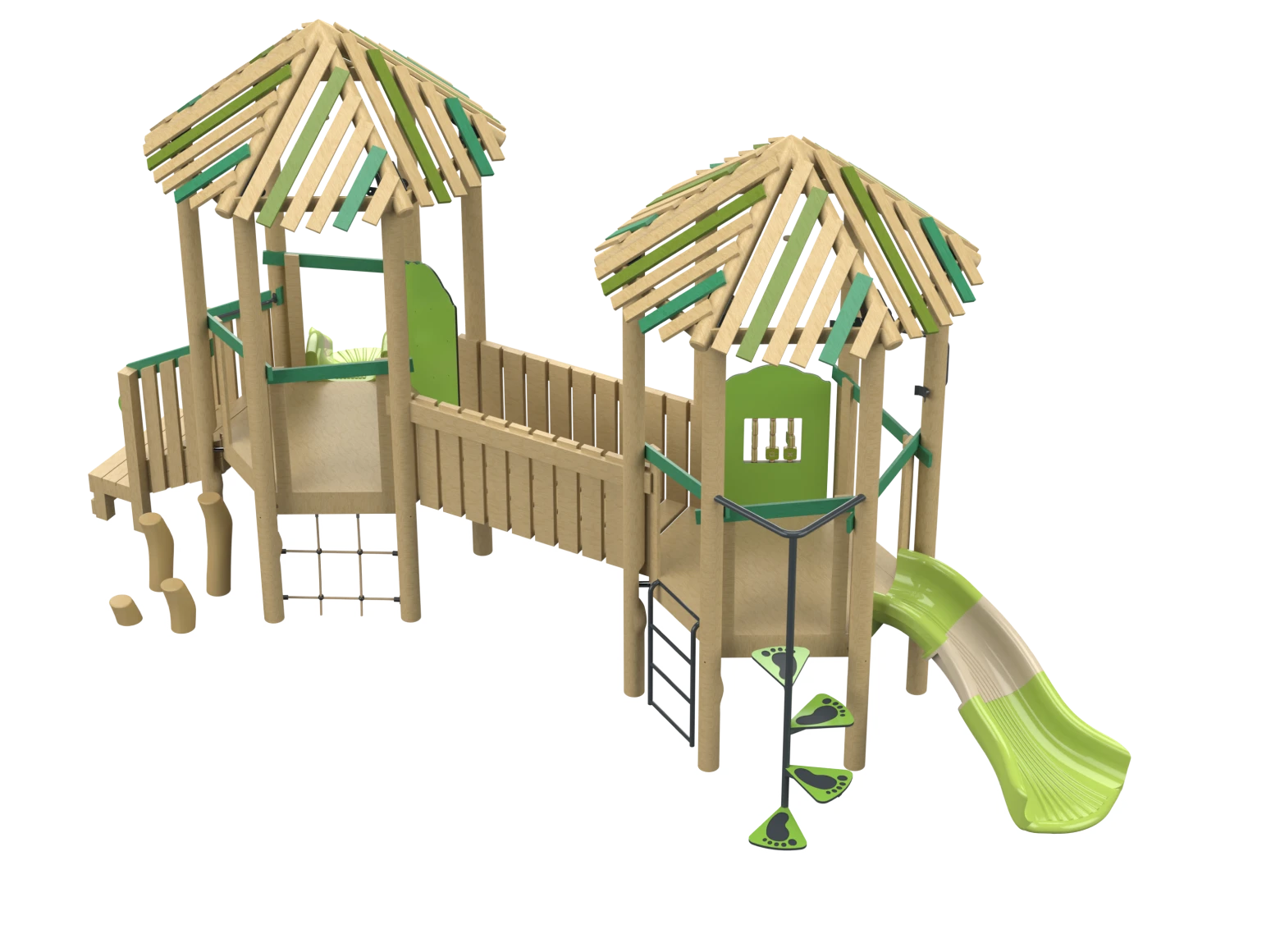 The Espresso model is a combined play system made from Robinia Wood, featuring two towers connected by a bridge. The system includes slides, climbing elements, and other play activities suitable for children of various ages. The natural Robinia Wood design blends wonderfully into green environments, providing children with a sense of adventure while developing motor skills, balance, and coordination.