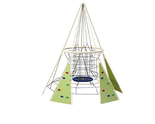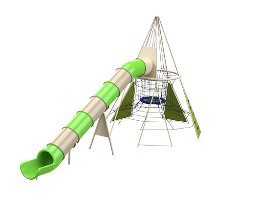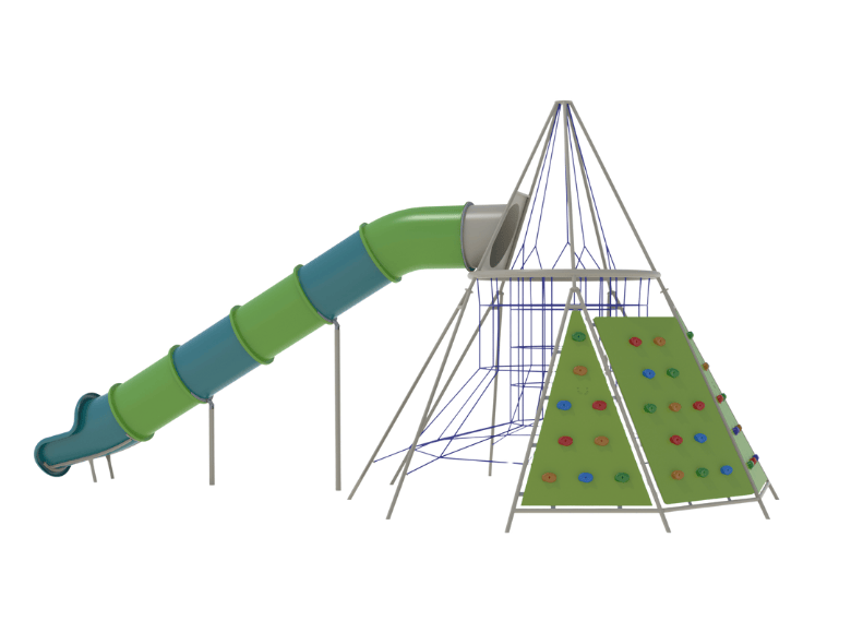 The Extreme Pyriamid A is a challenging pyramid-shaped structure for climbing and sliding, standing at 5 meters tall. The structure includes three climbing walls with hand and foot holds. From the peak of the structure, a 7-meter-long tube slide extends, and at its center, numerous climbing and grip cables are attached, creating challenging climbing routes. Suitable for games that develop imagination, physical development, and social intelligence. Encourages curiosity and exploration, independence, spatial orientation, stage planning, and proper organization.
