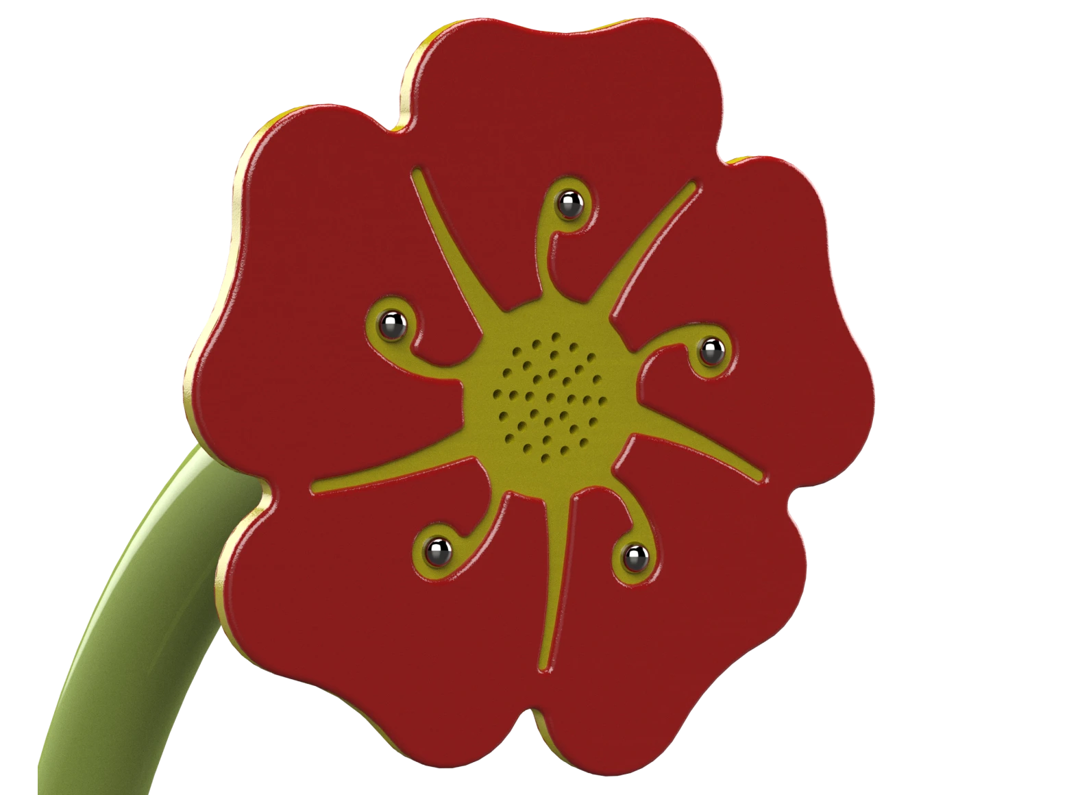 Flower-shaped tubes to carry voices across wide spans of the playground. Features a flower-shaped step for toddlers. An underground pipe connects two flower tubes located at a distance from each other in the garden area, allowing sound to be transmitted from one tube to the other.