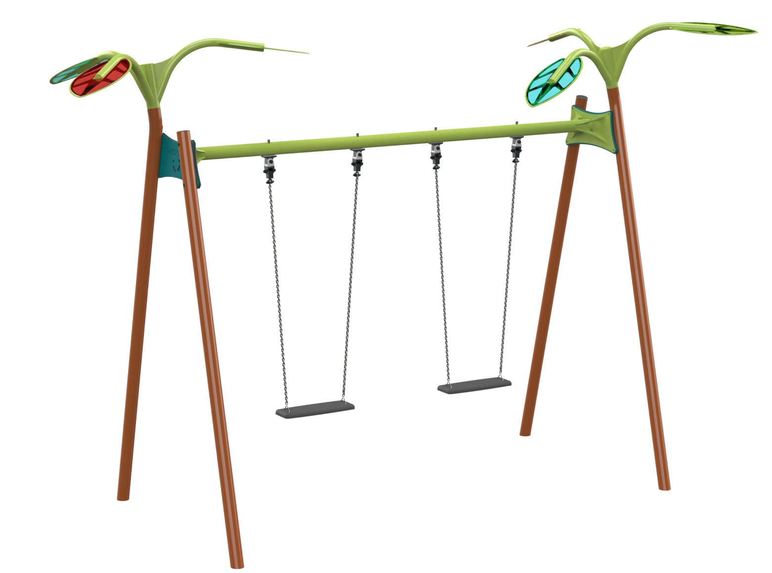 The swing set is one of the central and most beloved structures in any playground, offering a unique play experience that combines a sense of freedom, exhilaration and social interaction. Swinging provides children with a sense of excitement but can also be calming, all while helping to develop important motor skills such as balance and coordination. A double-seat swing set from the Forest series, its design is inspired by nature, with colorful leaf crowns made of semi-transparent polycarbonate that add a magical and unique dimension to the playset. Customer’s choice in seats: Toddler Seat: A rubber seat designed in a closed structure with a leg divider for safe use by young children. Suitable for seated infants up to the age of three. 3-and-Up Seat: A flat seat, suitable for children and adults, made from rubber for softening impacts.