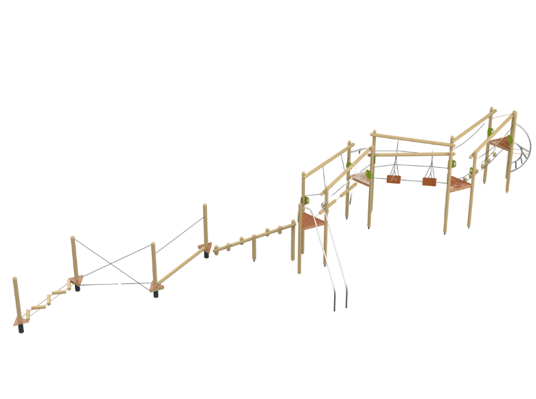 Liberica is a challenging fitness course made from Robinia Wood, consisting of various elements designed to encourage children to develop motor skills, strength, and balance. The course includes climbing elements, challenging bridges, and crossing paths, providing a fun and challenging play experience. The natural wood design blends into the environment, complementing the natural look of the playground.