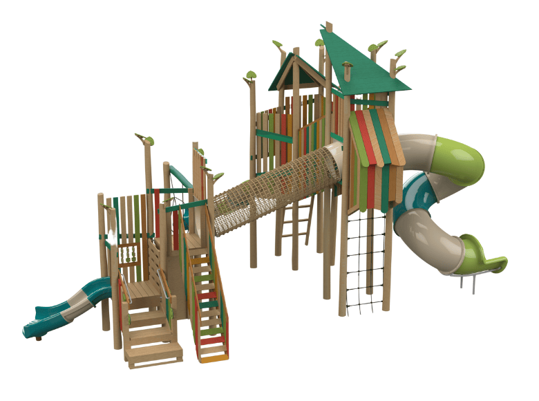 The Risotto play system is made from natural European Robinia Wood and blends harmoniously into outdoor spaces such as playgrounds and parks. The system offers a variety of activities, including twisting slides at different heights, rope ladders, and climbing elements that allow children to explore, climb, slide, and play together. The natural design and subtle colors create an inviting environment that encourages physical activity, creativity, and social interaction.