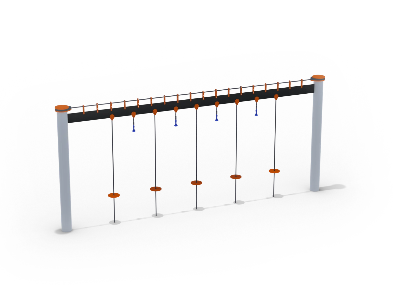 The Seven Mile Bridge F structure is primarily intended for older teenagers. It’s made from a combination of high-quality materials resistant to especially heavy use. Poles are made of steel, 8 inches in diameter with a 4mm wall thickness, topped with a decorative HDPE cover. Pole connectors are made of cast steel and welded to the pole to prevent connection collapse, with a decorative and modular HDPE connector above, giving the equipment a prestigious look. Cables have a steel core covered with a pleasant-to-touch polyester material. Cable thickness is 18mm, with cable ends connected using aluminum ball connectors to protect against wear. Stepping areas are made of aluminum bars and multi-layered rubber straps.