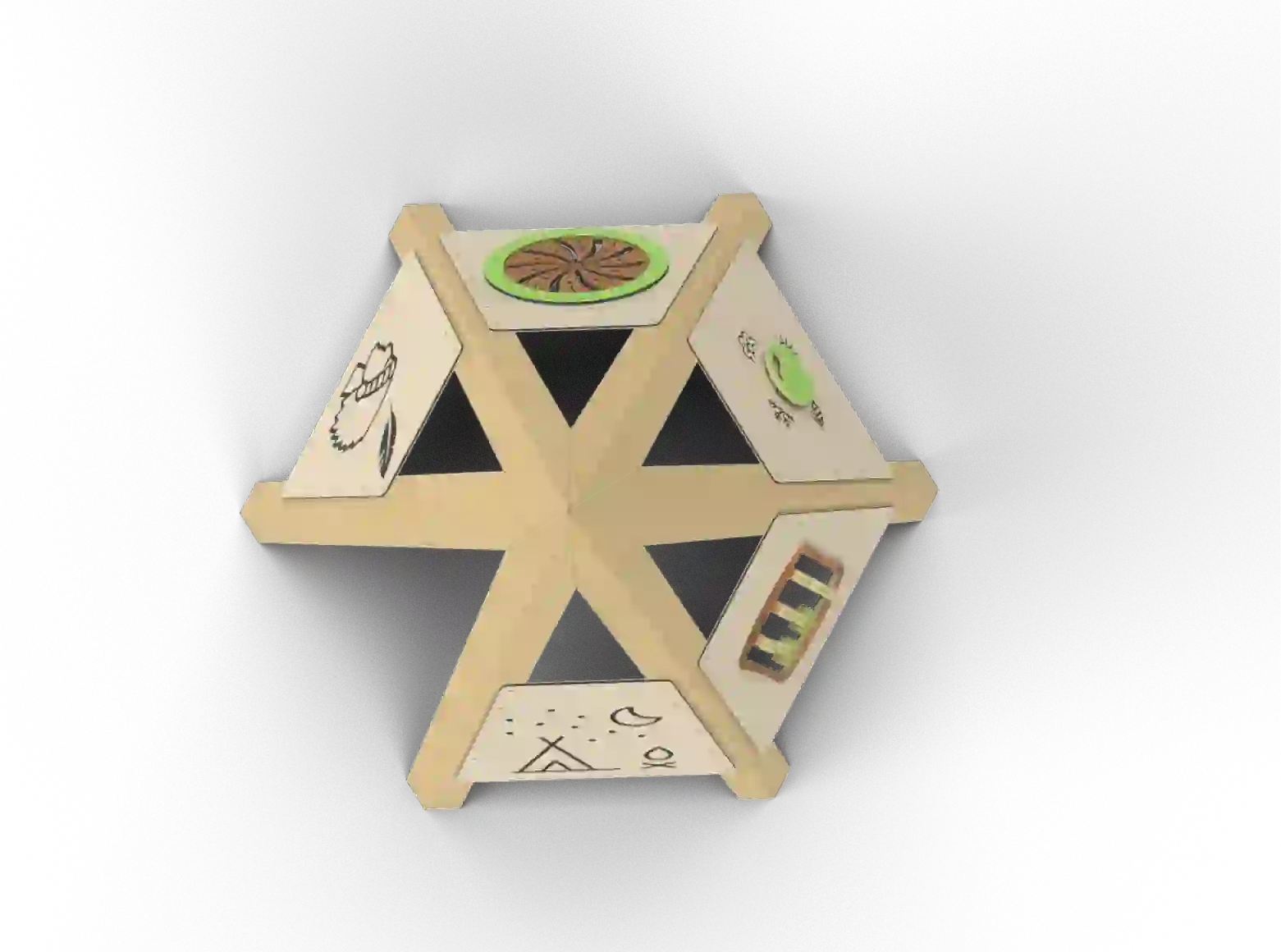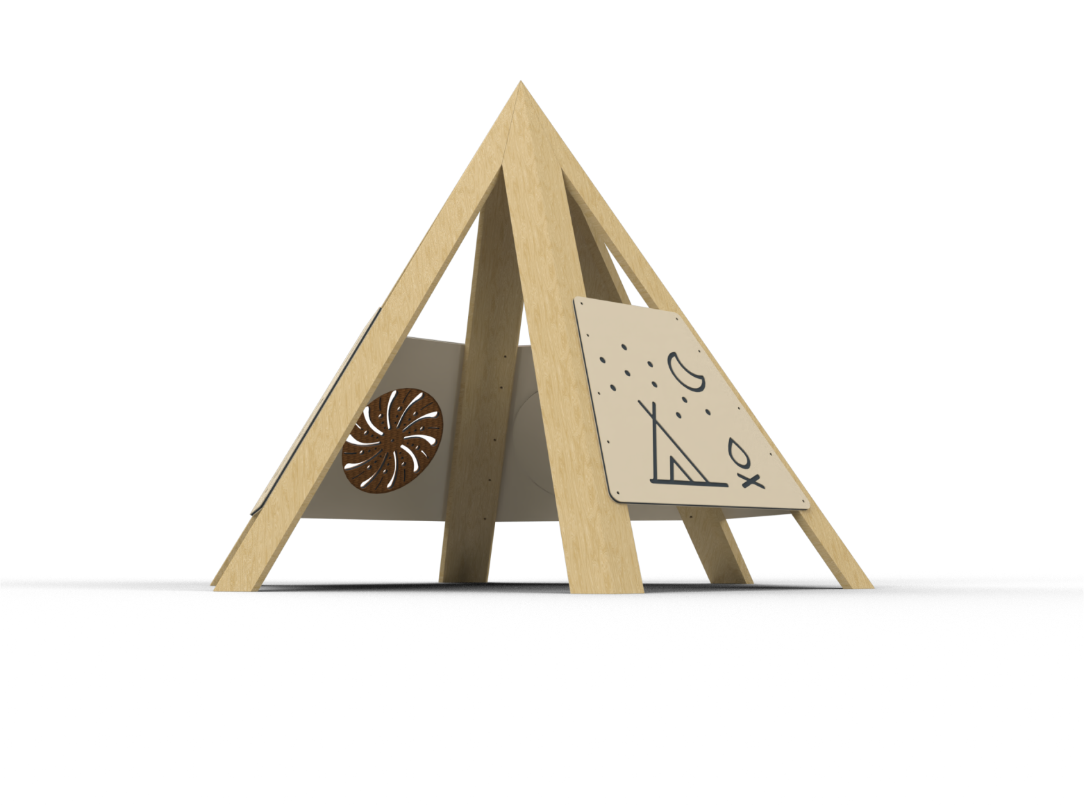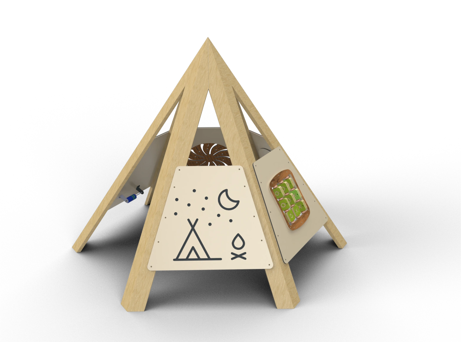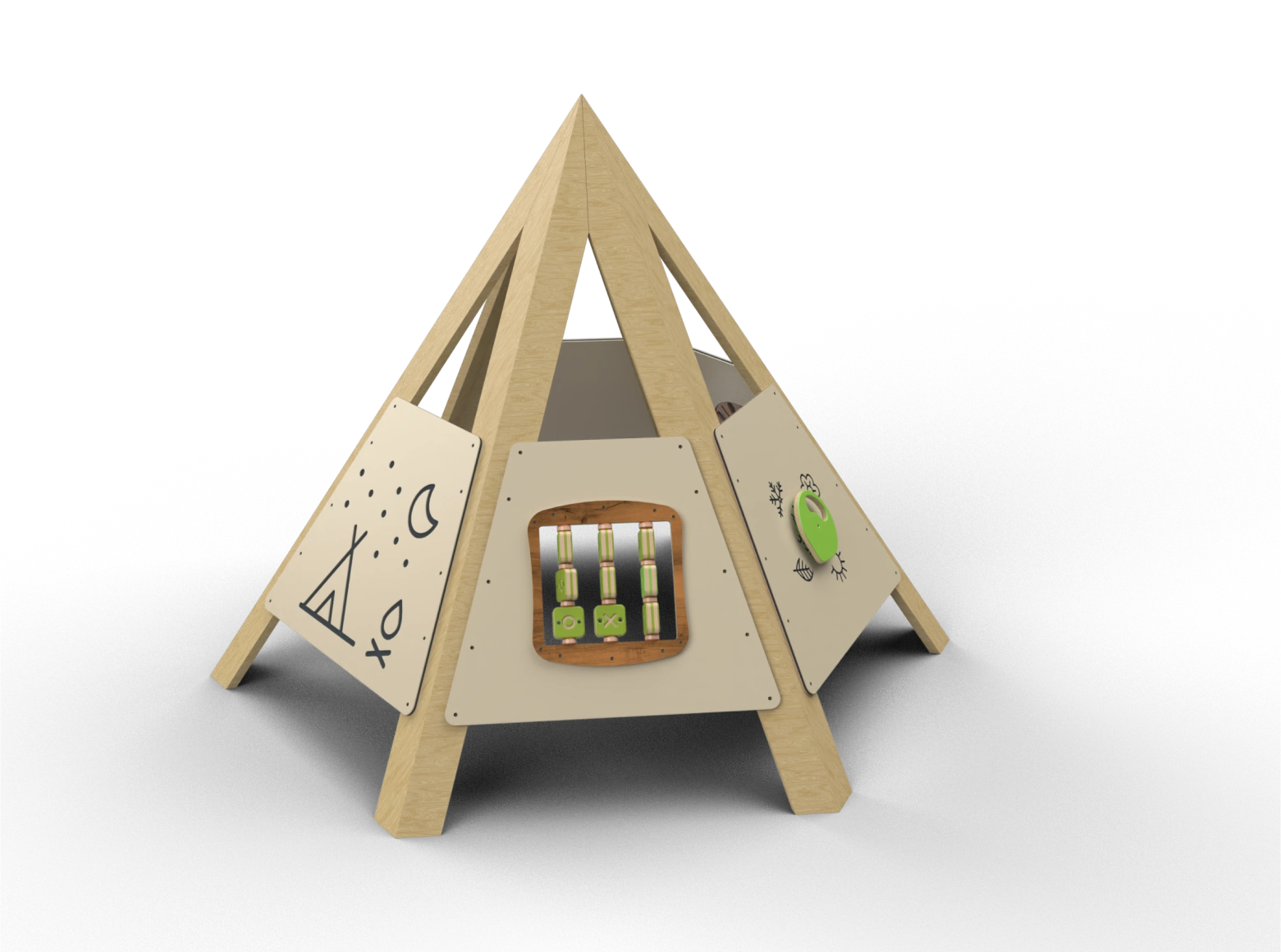 This Robinia Teepee structure combines natural Robinia Wood with children’s play panels, offering various play experiences such as tic-tac-toe and a seasons panel. The Teepee invites children to enter an imaginary world where they can play, communicate, and engage in diverse activities within a structure designed to resemble a Native American teepee. The installation encourages the development of children’s imagination, creativity, and social skills while providing an enjoyable and enriching play experience.