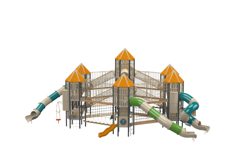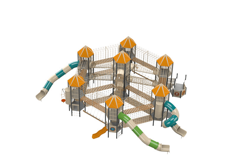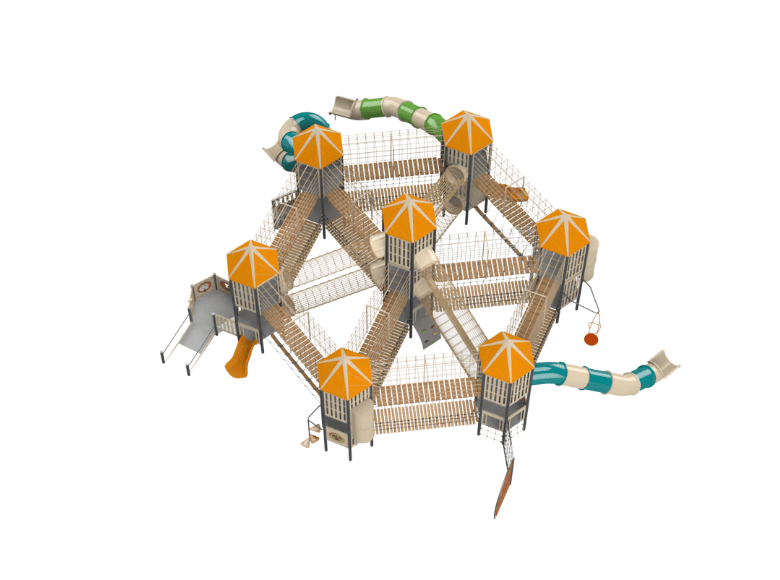 The Washington A play system is a spectacular and unique playground equipment that incorporates many innovative elements to encourage children’s physical, cognitive, and social development. The structure was carefully designed with an emphasis on creating a unique and challenging play experience, allowing children to experience different elements of climbing, sliding, and balance. The structure includes several impressive towers of different heights, giving children a unique view of the surroundings. In addition, the structure combines 22 cable bridges of various types creating diverse climbing and play routes, as well as several inclined crawling bridges and standing jungle bridges. The structure also includes climbing walls, twisted and transparent tube slides at different heights, and spiral steps. Its unique design creates a sense of a mystery and invites exploration and experimentation. Every element in the structure was designed to encourage children to develop their imagination, physical abilities, and social intelligence. Washington A is a structure designed to provide a unique and unforgettable experience that arouses curiosity and a desire to return and play again and again.
